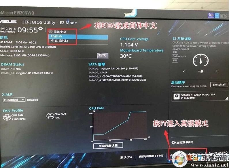 1、重启华硕电脑按esc或f8进入BIOS设置,将bios改成简体中文,然后按F7进入高级模式,如下图所示;