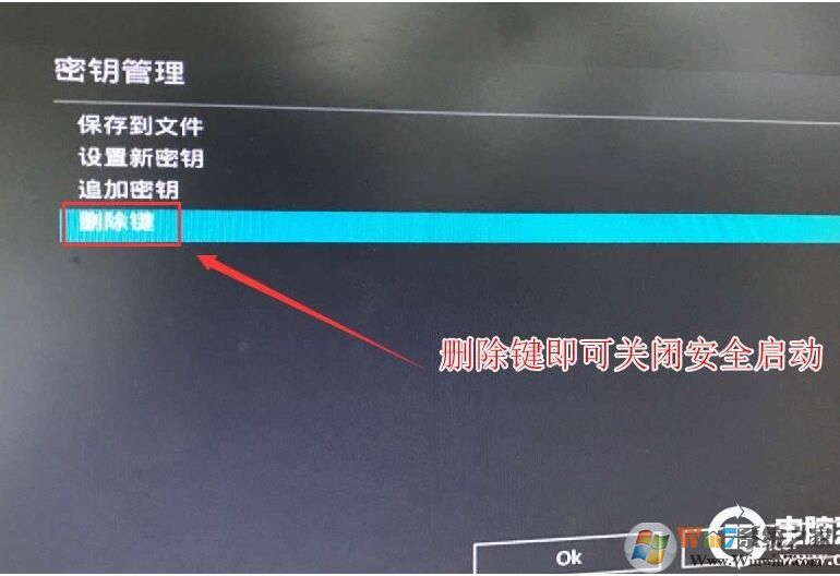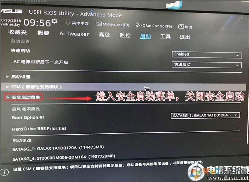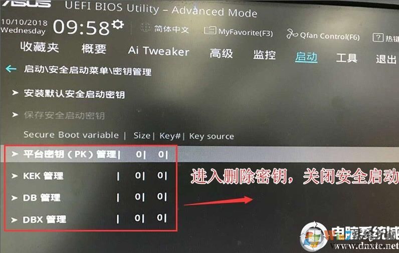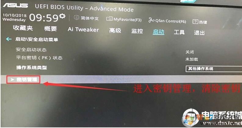 2、进入高级模式后,按→方向键移动到"启动"选项,选择安全启动菜单,然后回车进入密钥管理清除密钥关闭安全启动;