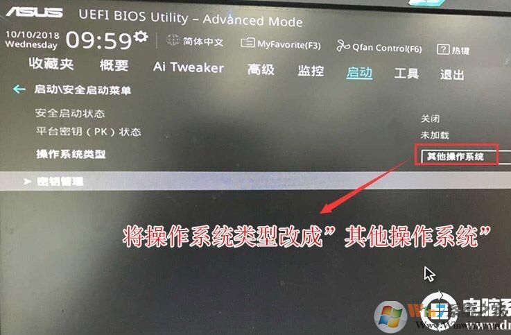 3、再返回到"安全启动菜单"的选项,将操作系统类型改成"其它操作系统",如下图所示;