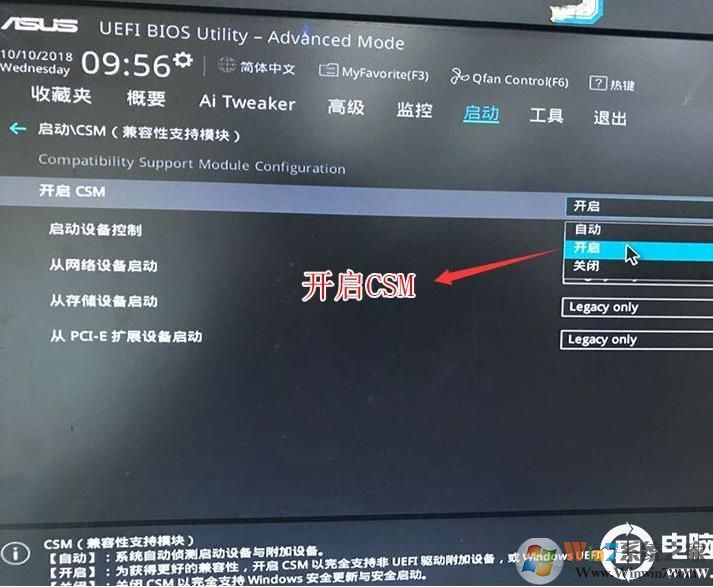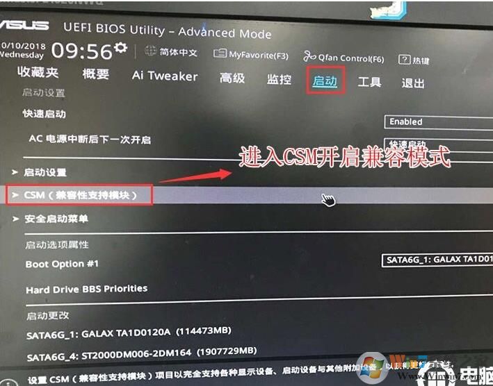 4、再返回到"启动"的选项,把CSM由disabled改成enabled,开启兼容模式,如下图所示;