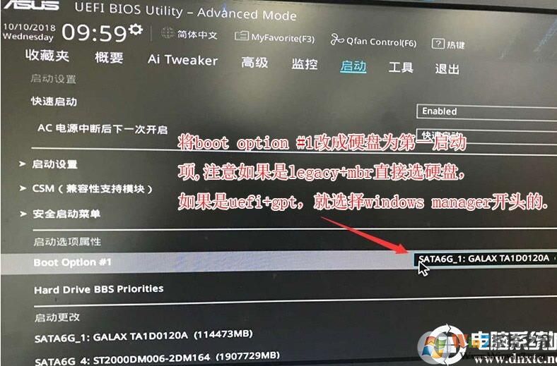 4、继续把boot option#1选项改为普通引导的,设置第一启动项为普通硬盘引导,如果采用的是uefi+gpt的就要选带Windwos Boot Manager的为UEFI引导分区,然后按F10保存设置;