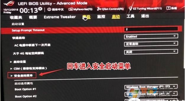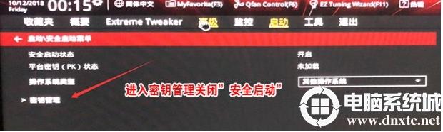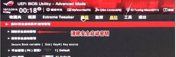 2、进入高级模式后,按→方向键移动到"启动"选项,选择安全启动菜单,然后回车进入密钥管理清除密钥关闭安全启动,如下图所示;