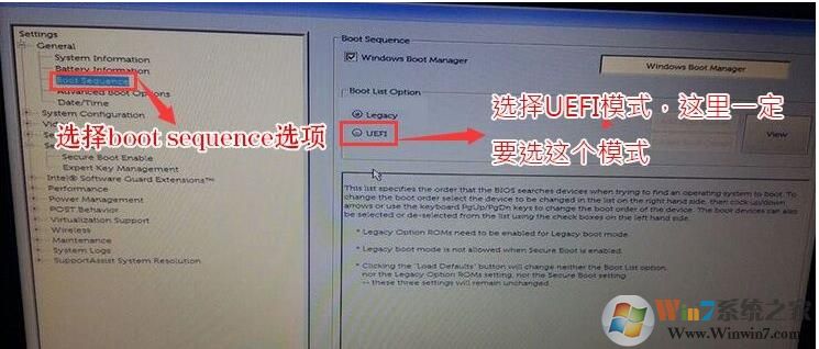 2、切换到BOOT Sequence项,如果将boot list Opion引导模式选择为uefi,这里一定记得设置uefi,要不戴尔机器引导不了,如下图所示;