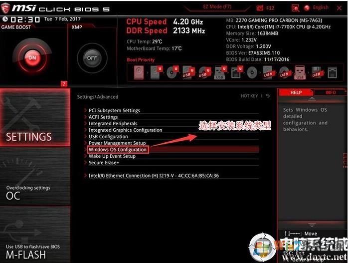 3、再将键盘方向盘往下移,移动windows os configuration选项选择安装系统类型,如下图所示;