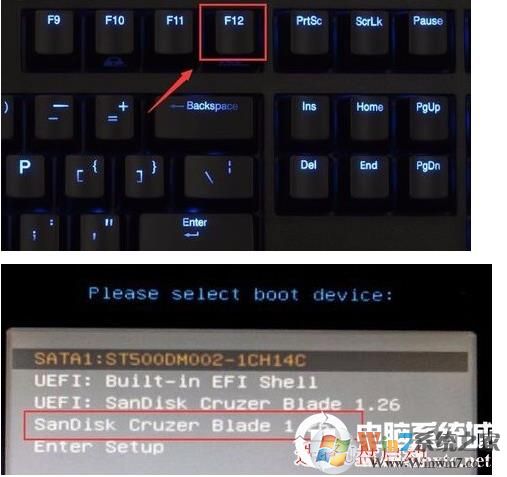 5、插入U盘启动盘,重启不停的按F12,选择识别到U盘启动项(默认有uefi U盘启动和传统模式,这里记得要uefi启动的就要制作支持uefi的U盘启动),回车,如下图所示;