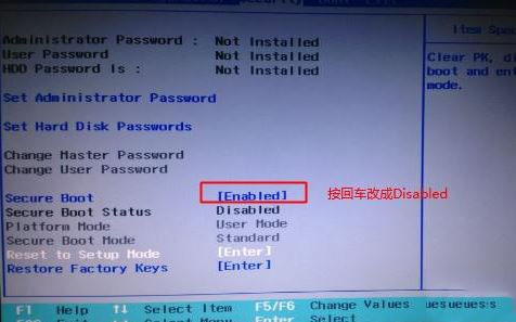 1、开机一直按F2或(FN+F2)进入BIOS,按→方向键切换到Security,选择Secure Boot回车设置成Disabled(关闭安全启动);