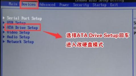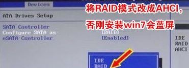 4、切将键盘移动Devices选项,把键盘移动ATA Drive Setup回车,将configure SATA as中默认的raid改成ahci模式,否则安装win7时会出现0x0000007b蓝屏或PE中找不到硬盘,因为win7中没有集成raid硬盘驱动,然后选择F10保存设置,在弹出的选项中选择YES,如截图哦: