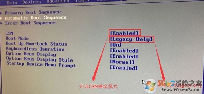 3、切换到Boot,把Boot Mode从UEFI改成Legacy only引导模式,再把csm默认disabled改成enabled,开启兼容模式,选择F10保存设置,在弹出的选项中选择YES,如截图哦: