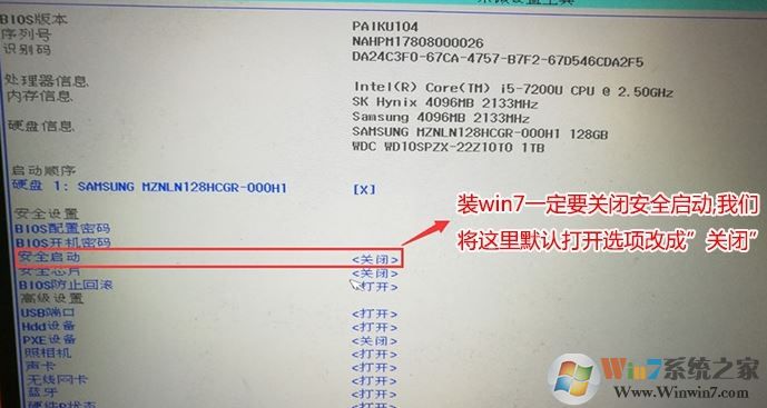 3、选然后我们再将键盘往下移动,将安全启动(Secure Boot)由默认的打开(enabled)状态改成关闭(disabled),如下图: