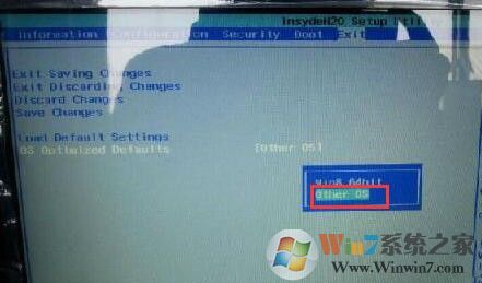 1、按开机键,等待开机画面出现时按f2进入bios,点击Exit,把OS optimized Defaults里默认Win8 64bit改成Other OS。