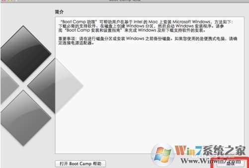 2、在弹出”Boot camp助理“-简介窗口,点击”简介“窗口右下角”继续“按钮;