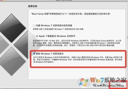 3、在弹出“Boot camp助理”-选择任务窗口,点选“移除Windows 7或更高版本”,然后,点击“继续”按钮。