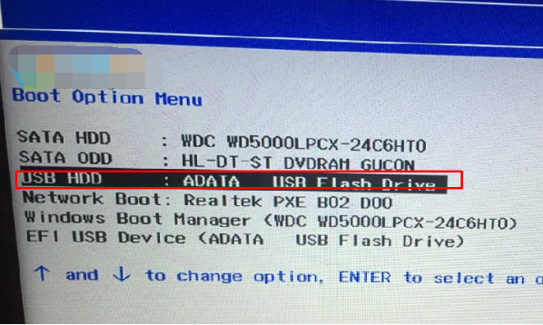 1、重启后,我们按下FN+F12键,就可以启动设备选项界面了~选择你的U盘启动盘(USB HDD开头的),回车即可;