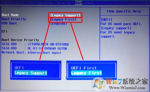 (3)在计算机重新启动至“Lenovo“LOGO画面时,并按下笔记本键盘上“F2”键或“Fn键+”F2“键进入笔记本的BIOS设置界面(若您的笔记本为Y400、Y500请您在计算机重新启动至“Lenovo“LOGO画面时按下笔记本的电源开关关闭计算机之后,按下”一键恢复按”钮开机,通过选择启动菜单中的“BIOS Setup”项目再次进入BIOS设置界面)将按下键盘上“→”键菜单移动至“Boot“项目,找到该项目下的”Boot Mode“选项,按下“回车”键打开该选项的设置菜单,按下键盘上“↓”按键,将该选项默认的”UEFI“修改为”Legacy Support“之后按下“回车”键确认,再按下键盘上“↓”按键选择”Boot Priority“选项,按下键盘上“↓”按键将该选项默认的”UEFI First“修改为”Legacy First“之后按下“回车”键确认。之后再按下笔记本键盘上“F10”键或“Fn键+”F10“键启动BIOS保存设置窗口,在该窗口中直接按下笔记本键盘上的”回车“键启动BIOS保存设置并重新启动计算机功能。