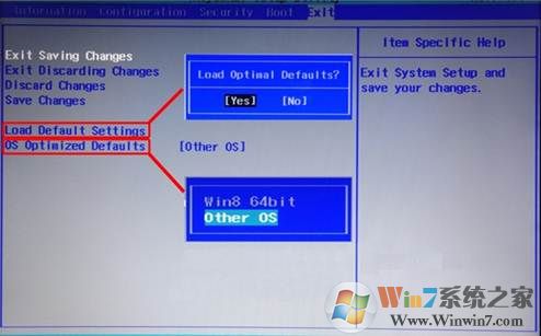 (2)进入BIOS设置界面后,按下键盘上“→”键将菜单移动至“EXIT“项目,按下键盘上“↓”按键选择到” OS Optimized Defaults“选项,按下“回车”键打开该选项的设置菜单,按下键盘上“↓”按键,将该选项默认的”Win8 64bit“修改为”Others“之后,按下“回车”键确认。之后按下键盘上“↑”按键选择到”Load Default Setting“选项,按下回车键启动恢复BIOS默认功能窗口,在该窗口中直接按下笔记本键盘上的”回车“键启动BIOS恢复默认功能。之后再按下笔记本键盘上“F10”键或“Fn键+”F10“键启动BIOS保存设置窗口,在该窗口中直接按下笔记本键盘上的”回车“键启动BIOS保存设置并重新启动计算机功能。