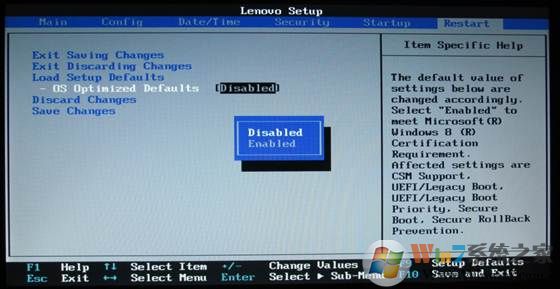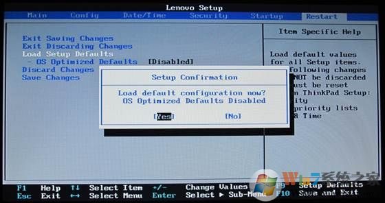 2. 扬天VBKEM机型预装的Windows 8/8.1系统改装为Windows 7系统的具体操作步骤(1)先重新启动计算机,并按下笔记本键盘上“F1”键进入笔记本的BIOS设置界面。(2)进入BIOS设置界面后,按下键盘上“→”键将菜单移动至“Restart“项目,按下键盘上“↓”按键选择到” OS Optimized Defaults“选项,按下“回车”键打开该选项的设置菜单,按下键盘上“↑”按键将该选项默认的”Enabled“修改为”Disabled“之后,按下“回车”键确认。按下键盘上“↑”按键选择到”Load Setup Defaults“选项,按下回车键启动恢复BIOS默认功能窗口,在该窗口直接按下笔记本键盘上的”回车“键启动BIOS恢复默认功能。之后再按下笔记本键盘上“F10”键启动BIOS保存设置窗口,在该窗口中直接按下笔记本键盘上的”回车“键启动BIOS保存设置并重新启动计算机功能。