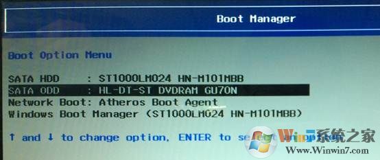(4)在计算机重新启动至“Lenovo“LOGO画面时,并按下笔记本键盘上“F12”键或“Fn键+”F12“键进入笔记本的引导设置界面(若您的笔记本为Y400、Y500请您在计算机重新启动至“Lenovo“LOGO画面时按下笔记本的电源开关关闭计算机之后,按下”一键恢复按钮”开机,按下键盘上“↓”按键选择启动菜单中的“Boot Menu”项目之后按下“回车”键进入引导设置界面)。在此时将您笔记本的光驱托盘弹出,放入正版的Windows 7操作系统光盘之后将光驱托盘推回,同时选择该界面中的“SATA ODD“或“USB ODD”项目并按下”回车“键,以实现u盘启动。