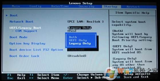 (3)在计算机重新启动至“Lenovo“LOGO画面时,并按下笔记本键盘上“F1”键进入笔记本的BIOS设置界面,按下键盘上“→”键将菜单移动至“Startup“项目,按下键盘上“↓”按键选择到”UEFI/Legacy Boot“选项,按下“回车”键打开该选项的设置菜单,按下键盘上“↓”按键并将该选项默认的”Both“修改为”Legacy Only“之后按下“回车”键确认。再按下笔记本键盘上“F10”键启动BIOS保存设置窗口,在该窗口中直接按下笔记本键盘上的”回车“键启动BIOS保存设置并重新启动计算机功能。