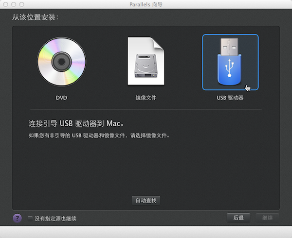 2、Parallels Desktop提供三种安装介质供用户选择:CD光盘、镜像文件以及USB驱动器。这里选择“USB驱动器(如何制作系统安装U盘)”。点击“继续”,Parallels Desktop 自动检测到系统信息,单击“继续”,进行下一步安装。