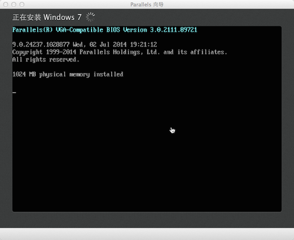 5、配置完成后Parallels向导进入虚拟机BIOS启动界面并自动开始安装Windows 7。熟悉的Windows 7安装界面,稍等片刻,Windows7即能自主安装成功。