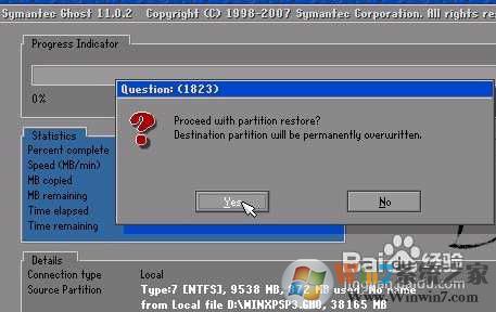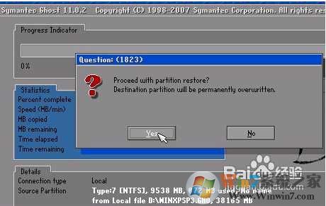 7、接着会弹出询问是否要还原到这个分区的确认对话框,选择“Yes”即: