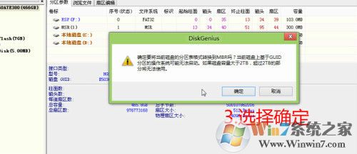 3、转换完成后,执行快速分区,分区大小几磁盘个数自己选择,确保分区表类型为MbR ,及勾选了重建主引导记录MBR,按下确定后开始分区(对了,如果是固态硬盘可要4K对齐一下哦);