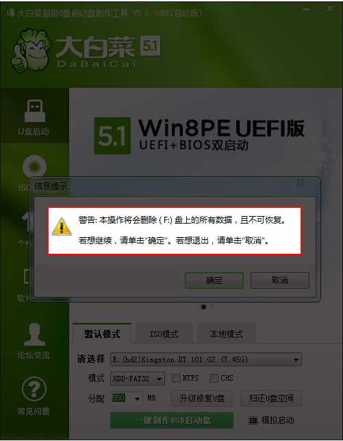 按钮,程序会提示是否继续,确认所选U盘无重要数据后开始制作: