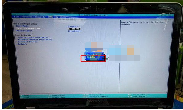 5,最后就是把External Devico Boot项里的Diabled改成Enabled(这样做的目的是支持外部设备启动),然后按F10保存退出,如所图所示: