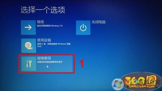4、到“选择一个选项”这里,用鼠标或者键盘按点击“疑难解答”。如下图所示: