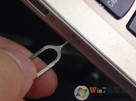 2、用取卡针捅一下机器左侧的一键恢复孔;