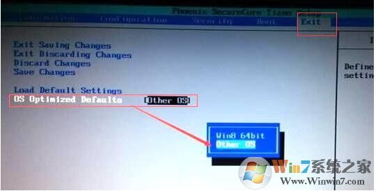 3、接着更改bios默认系统,在exit选项下,自带出厂时机器默认的是win8 64bit,我们要将其改成Other OS,如图: