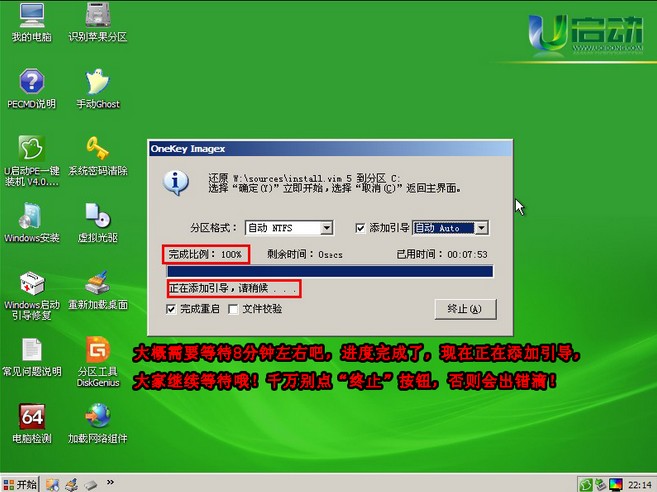 大概需要等待8分钟左右就完成,完成后软件自动添加引导,我们继续等待,切勿点终止按钮!如下图所示:
