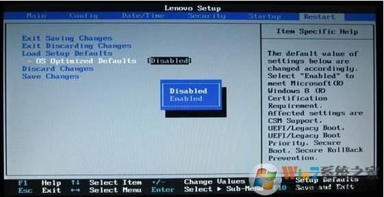 OS Optimized Defaults是一个“顶级”设置选项,开启该选项后,BIOS会自动将所有相关选项(即下文将要介绍的每个选项)恢复为预装Win8/8.1默认启动方式所要求的标准设置,即开启UEFI+开启安全启动。
