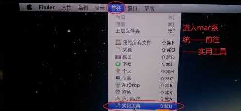 3、在MAC系统中,点击菜单上的【前往】—【实用工具】—【Boot Camp】如下图;