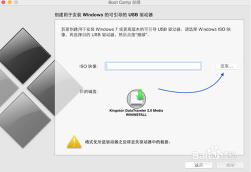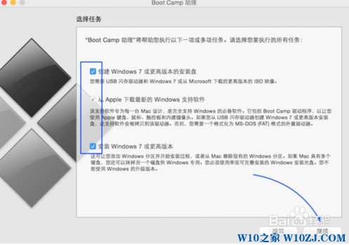 4、打开Boot Camp,然后勾选“创建Windows7安装盘”,接着点继续;(此时你也可以勾选从Apple下载最新的Windows支持软件,也就是驱动什么的,还有勾选安装Windows或更高版本);