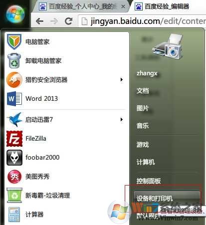 2、打开你的安装 Windows 7系统的电脑,连接到跟 XP 系统相同的局域网。然后点 Windows 按钮,找到“设备和打印机”,点击它。