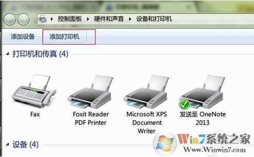 3、点开“设备和打印机”之后,点击顶部第二个按钮“添加打印机”。