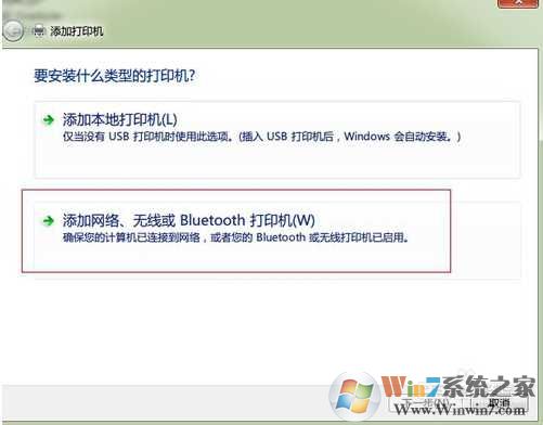4、添加打印机的时候,他会问你要安装什么类型的打印机,由于我们要安装 Windows XP 电脑共享的打印机,所以我们选择“添加网络、无线或 Bluetooth 打印机。如下图中红框里面的。