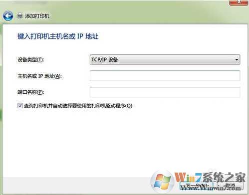 7、此时,设备类型我们选择“TCP/IP 设备”,主机名或 IP 地址我们输入 Windows XP 系统的电脑的 IP 地址,然后选择“下一步”。