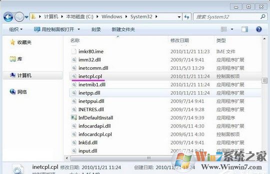 1、打开计算机C盘---windows---system32,找到inetcpl.cpl文件,鼠标左键点击inetcpl.cpl。