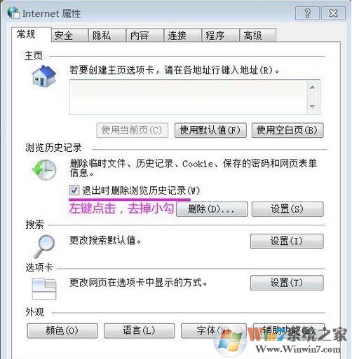 2、我们在弹出的Internet属性窗口找到浏览历史记录,左键点击退出时删除浏览器历史记录,去掉前面小框内的小勾,再点击确定。