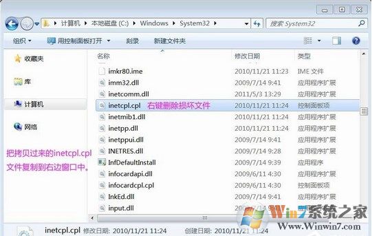 1、如果能找到与我们的计算机操作系统相同,IE也相同的计算机,可以在这台计算机上把inetcpl.cpl文件拷贝过来,复制到C:\windows\system32目录下(把已经损坏的inetcpl.cpl文件删除)。