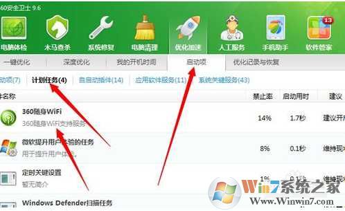 2、接下来点击启动项——计划任务。即可看到360免费wifi图标程序