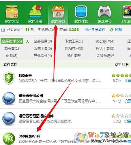 然后在软件卸载中卸载 360免wifi,当然大家也可以在Win7控制面板中卸载360免费wifi.