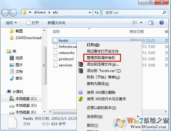 hosts这个文件是需要权限才能修改的,你可以用管理员身分打开记事本,再打开这个文件,也可以和小编一样先 右键取得管理员所有权;