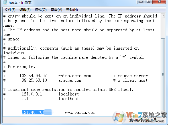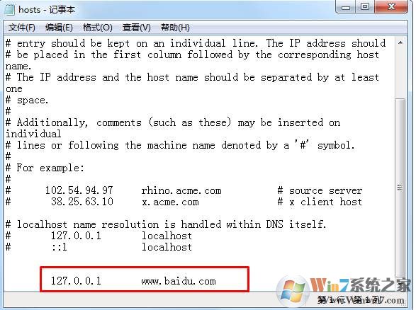 如下图所示,红框部分是小编添加的,目地就是把www.baidu.com 这个域名指向到127.0.0.1这个IP(这个IP指向本机)也就是什么都打不开了。