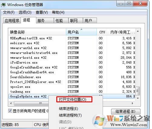 1、在进程中右键点击GoogleUpdate.exe 打开文件位置