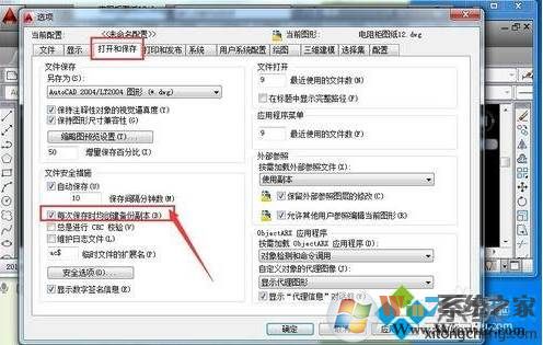 2、弹出的选项对话页面中,选择打开和保存,在文件安全措施下有一个选项,每次保存时均创建备份副本,这外对勾去掉,然后点击确定,这个图形文件保存时,就不会有相应的*.BAK文件了;