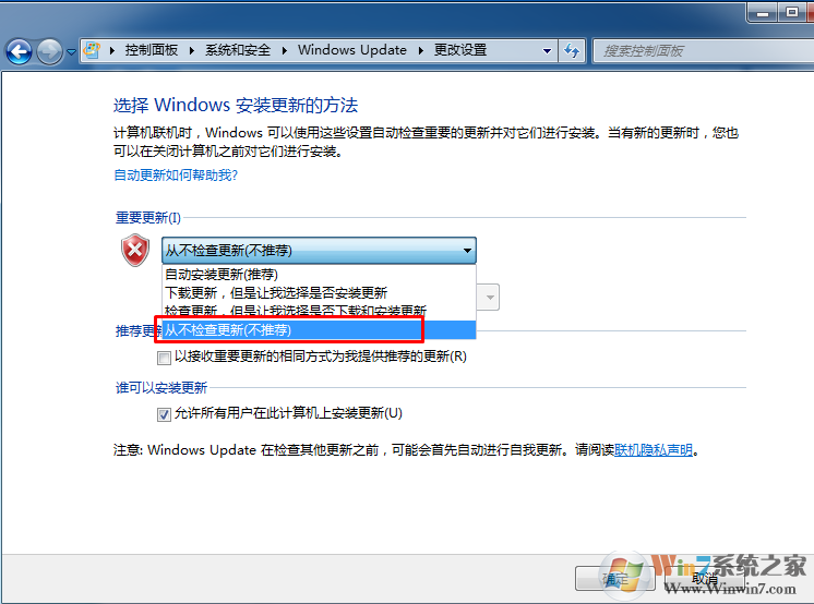 5.选择下拉栏 选择 除了“自动更新(推荐)”以外的其它选项,点击确定,最好选择从不检查更新
