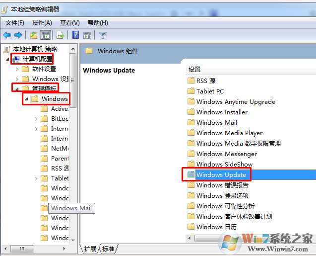 7.依次点开左边栏,找到管理模板/Windows组件,找到Windows Update,双击